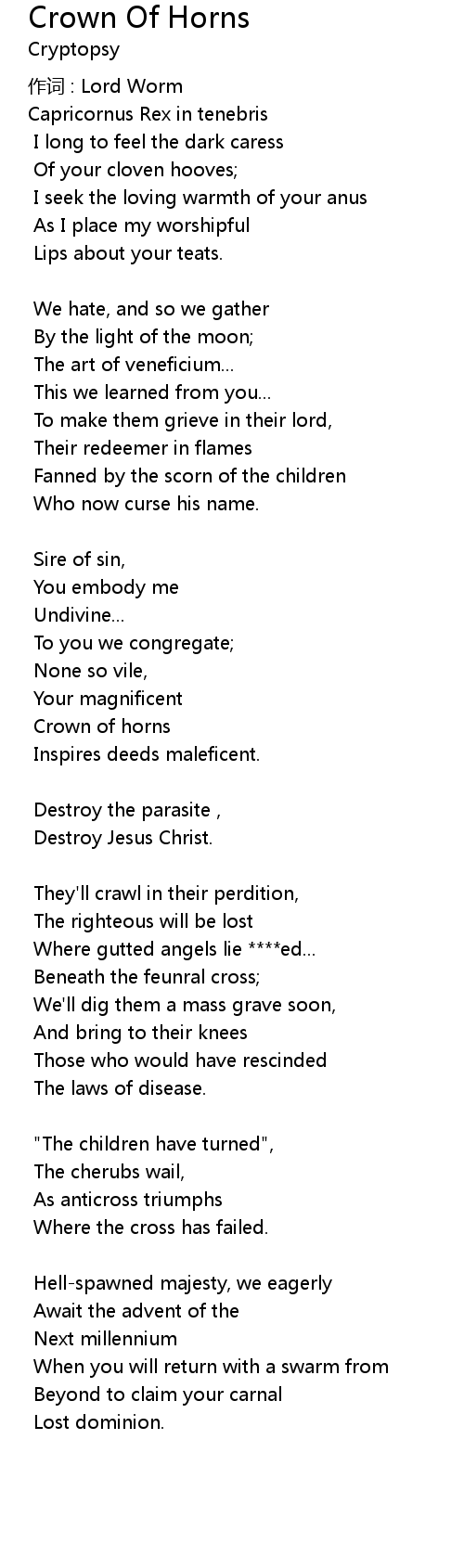 Cryptopsy Crown of Horns Lyrics Genius Lyrics Crown Of Horns Lyrics Baker Ya Maker Tenngage x hydra mane) by baker ya maker on desktop and mobile. Listen to crown of horns by baker ya maker. Provided to youtube by distrokidcrown of horns · baker ya makerthe vault℗ 886347 records dkreleased on: Baker ya maker · song · 2020. J a b lyrics (unreleased) 5. See lyrics and music videos, find baker ya maker tour. Crown Of Horns Lyrics Baker Ya Maker.